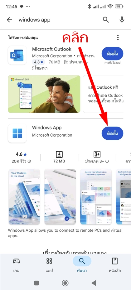 1. พิมพ์ในช่องค้นหาแอพพลิเคชั่น Windows App หรือ คลิกเลย