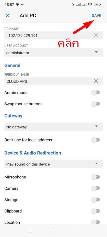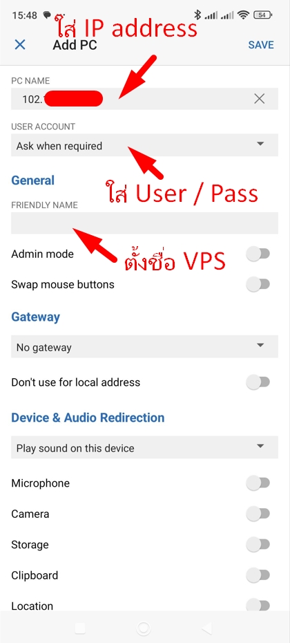 - กรอก IP Address ของ CloudVPS ที่ต้องการเข้าใช้งานในช่อง PC Name